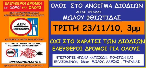 Η Επιτροπή κατοίκων και φορέων Λαμίας ενάντια στα Διόδια καλεί σε αγωνιστική κινητοποίηση την Τρίτη 23/11/10 ώρα 3.00μμ στην Αγία Τριάδα- Μώλου για να ανοίξουμε το νέο σταθμό διοδίων για ελεύθερη διέλευση των οδηγών.